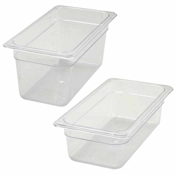 These easy to use, stackable1/3 Size Clear Polycarbonate Food Pans are handy for organizing in any kitchen commercial or residential. The clear PolyCarbonate plastic construction is highly durable and great for transporting, storing and serving raw or already prepped foods. Poly-Ware food pans are ideal while traveling to cater special events or on the go meals with friends and family. Guaranteed to arrive without mess, you can expect to serve you well organized and prepped food directly to a waiting hungry crowd of people. Durable plastic food pans are designed to withstand temperatures from -40ยฐF to 210ยฐF, making them NSF certified, dishwasher safe and crack-resistant for those unforeseen mishaps. Poly-Ware minimizes acidic reaction making it ideal for breads, meats, poultry, fruits and vegetables. These pans come in many various sizes making it easier to coordinate and pack more efficiently.