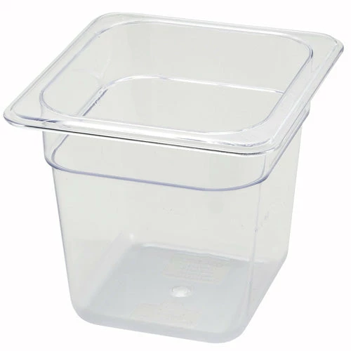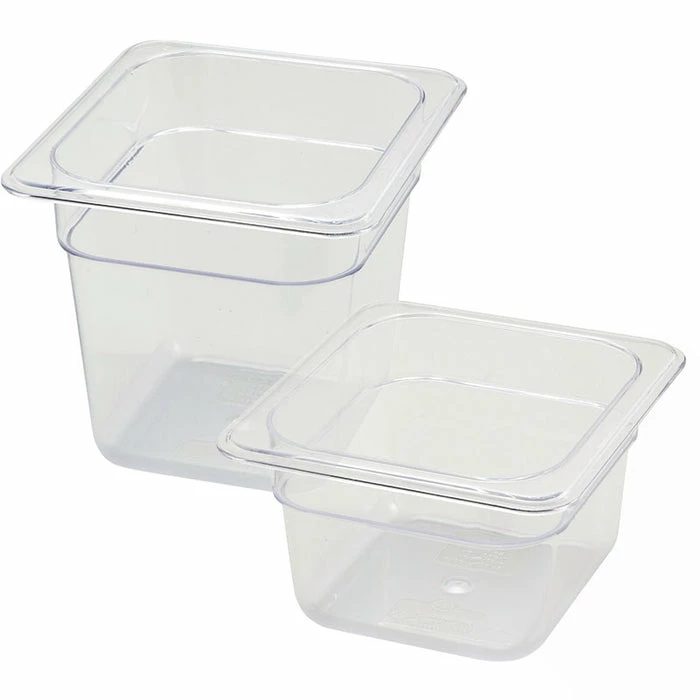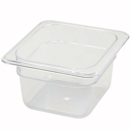 These easy to use, stackable1/6 Size Clear Polycarbonate Food Pans are handy for organizing in any kitchen commercial or residential. They are decided to withstand temperatures from -40ยฐF to 210ยฐF, making them NSF certified, dishwasher safe and crack-resistant for those unforeseen mishaps. Poly-Ware minimizes acidic reaction making it ideal for breads, meats, poultry, fruits and vegetables. The clear PolyCarbonate plastic construction is highly durable and great for transporting, storing and serving raw or already prepped foods. Poly-Ware food pans are ideal while traveling to cater special events or on the go meals with friends and family. Guaranteed to arrive without mess, you can expect to serve you well organized and prepped food directly to a waiting hungry crowd of people. These pans come in many various sizes making it easier to coordinate and pack more efficiently.