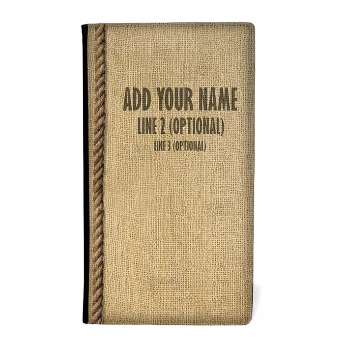 These check holders are constructed from a high quality leather and polyester material combo on the outside, with a soft velvet lining on the interior. The face of the folder showcases a full color, trendy burlap inspired design perfect for any type of service. The inside features 2 slots to hold checks, cash and receipts securely while the plastic slot is perfect for holding credit cards. Measures: 5.75″ x 10″.