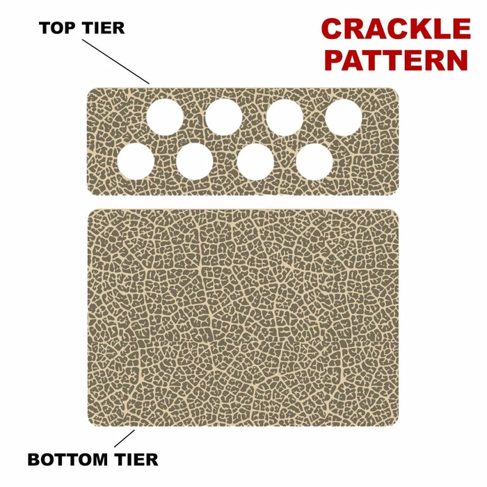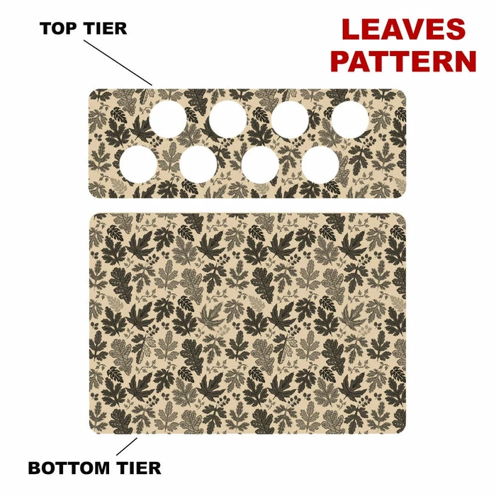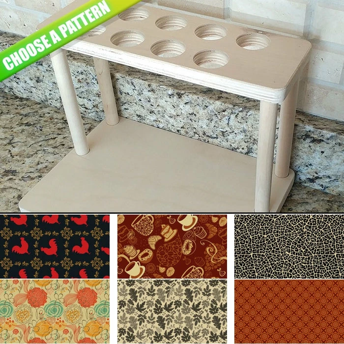 Introducing a simple and fun way to choose your Counter Caddy design from several pattern templates. You now have the ability to match up your kitchen theme simply by choosing from our wide selection! You also have the ability to choose the height of your unit. The Dowel Rods are available in 3.5″, 5,75″ and 7.5″ heights elevating your second tier to preferred under cabinet heights. The second tier features (8) 1.5″ Diameter holes that are ideal for storing your favorite K-Cup flavors.