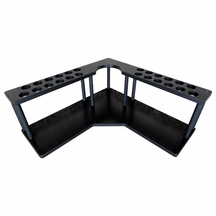 These 2-tier wood shelves are made out of baltic birch and designed to fit perfectly in the corner on the counter underneath your cabinets. The tall dowel rods lift the 2nd shelf up 7″ above the 1st shelf, allowing the perfect amount of space to hold your coffee-related supplies such as sugars, creamers, and other condiments. The smooth finish is easy to clean. This shelf also has rubber feet on the bottom, giving the bottom shelf a bit of space from your counter to help protect it from scratches and bacteria build-up. The top tier features 24 1.5″ diameter slots to perfectly stock your K-Cups and an inset for a 4.5″ diameter trash can.