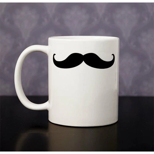 - Handlebar style mustache printed on both sides of the coffee mug