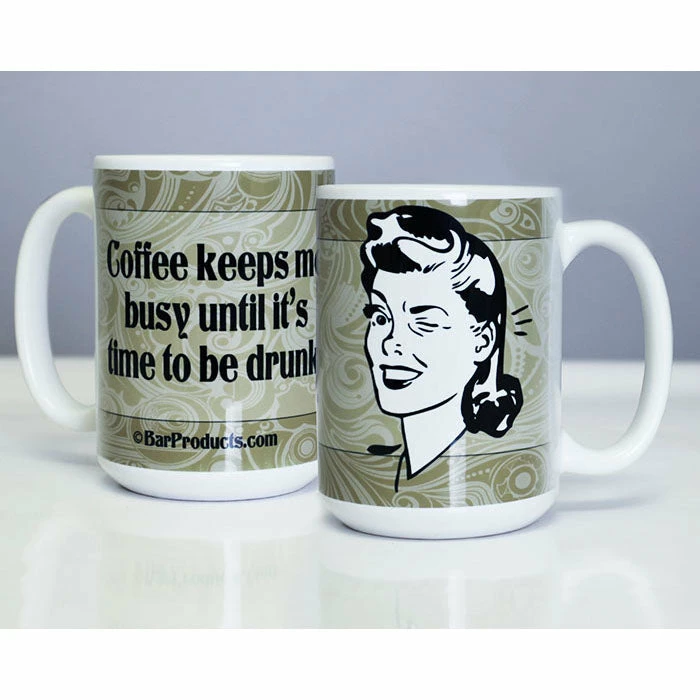 “Coffee keeps me busy until it’s time to be drunk.” This 15 ounce ceramic coffee mug is the perfect way to start your day. It is FDA compliant, UV resistant and offers a full color, sharp graphic. Dishwasher safe. Measures: 4.5” tall x 3.25” top rim x 2.5” base.