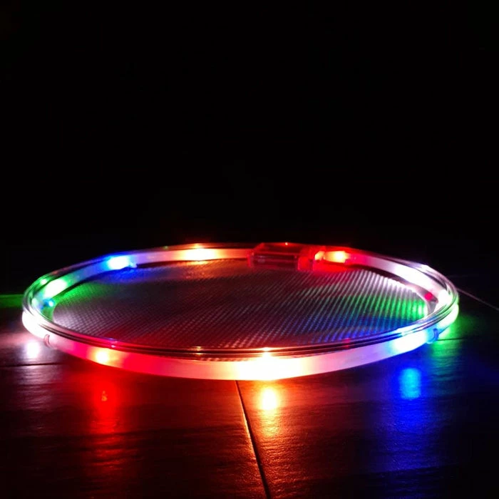 Clear 14” acrylic serving tray with mesh liner. Green, blue, red, and white LEDs circle this flashing server tray and light up in 3 different patterns that will ensure everyone will see you coming! This light up multi-color serving tray is guaranteed to be a fun addition to serving drinks or food. Our Flashing Multi-Color LED Serving Tray comes with three AA batteries already installed.