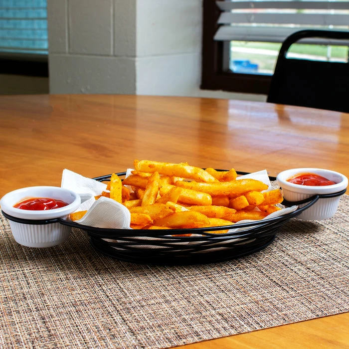 Serve up some delicious appetizers with this oval shaped wire basket. These Artesian collection baskets are perfect for serving various types of appetizers and entrees at your restaurant. They are made of black powder coated metal and come with two integrated 2 ounce ramekin holders. This product is hand wash only to preserve the life span of the coating. Ramekins are not included.